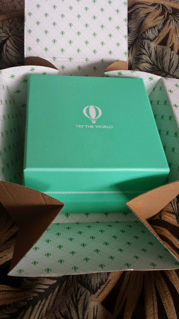 So... when I found this company I was excited to try out the surprises that they would send right to my door! Even better there was a chance to win a trip to Venice, a place that has been on my list of places to visit since high school and a place I named my late bunny. I have no idea how I found out about this company but I think it is a great concept and can really bring the 'World' to people's homes. As you can see the box is a gorgeous almost Tiffany blue color, we'll call it Audrey Hepburn green, because I adore her and this is a little more green than blue. It too can be a great gifting box if you have no idea what to use it for yourself.